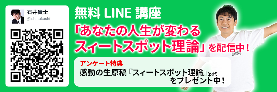 だから僕の場合はお金がないと、世の中から戦争がなくならないというね、個人の痛みじゃないんですけど世間的に地球的に、石井が、お金持ちにならなかったら地球ヤバいぞ!という感じで、もう地球の全部をね、人質にするみたいなそんな感じのモチベーションをかけて、仕事をしています。